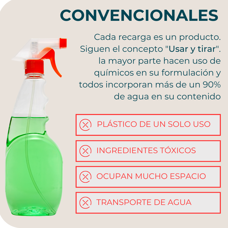 Son respetuosos contigo y con el medio ambiente: En su fabricación se produce 180 veces menos CO2 que en la producción de un limpiador concencional. Nuestros limpiadores están formulado con ingredientes naturales y biodegradables, son seguros para el medio ambiente y no daña la flora y la fauna local ni contribuye a la contaminación del aire o del agua.