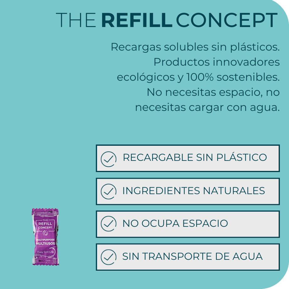 5 grs de producto, 500 ml. de agua del grifo y tú. Todo lo que necesitas para disfrutar de un eficaz multiusos. Cambias el hábito de reciclar la botella de plástico de un limpiador convencional cuando lo acabas, por el hábito de reconstituir el multiusos en casa cuando lo empiezas. Sustituir lo que está acabando con el planeta, por un nuevo comienzo, uniéndote a la revolución de las recargas.